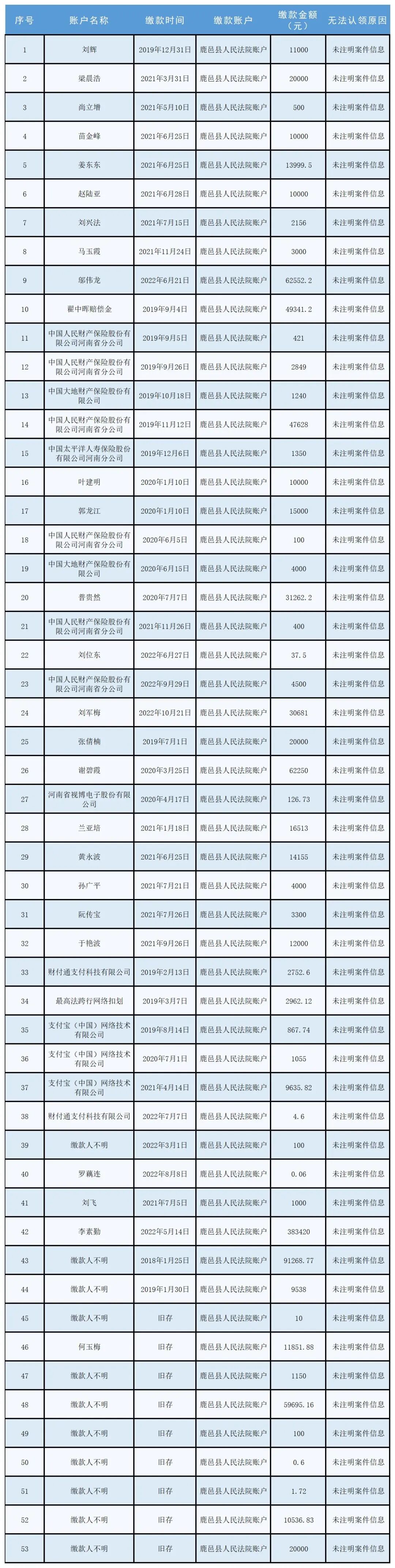 鹿邑县人民法院关于认领不明案款的公告 发布时间:2026-01-05 16:37:00