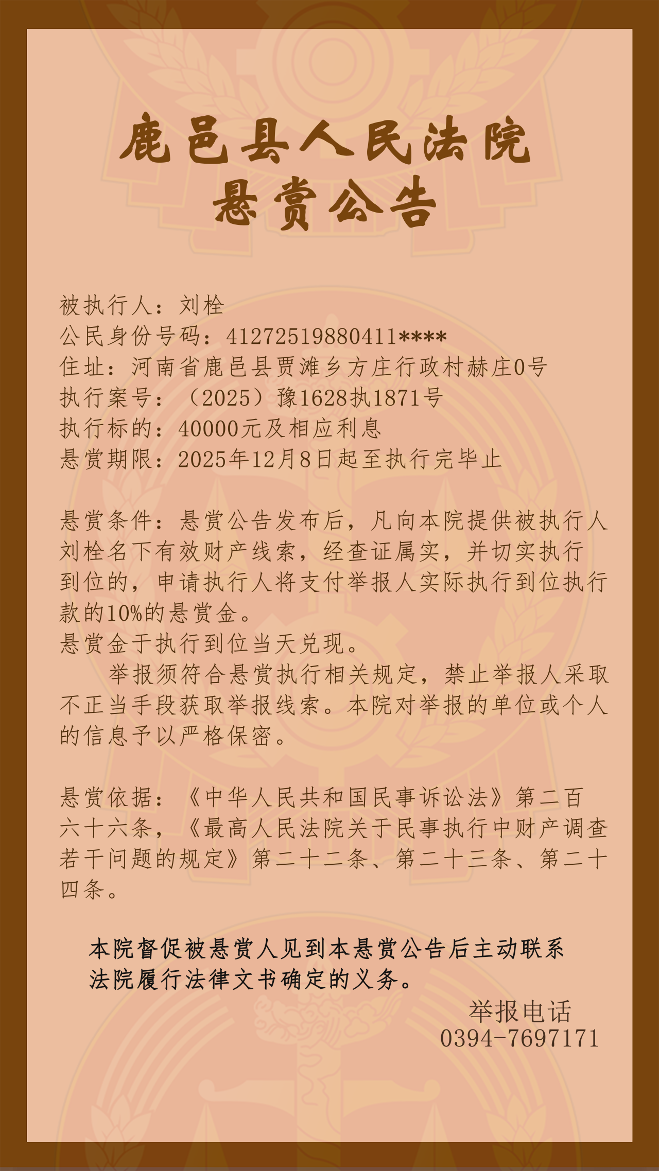 鹿邑县人民法院悬赏公告(2025年第60期)
