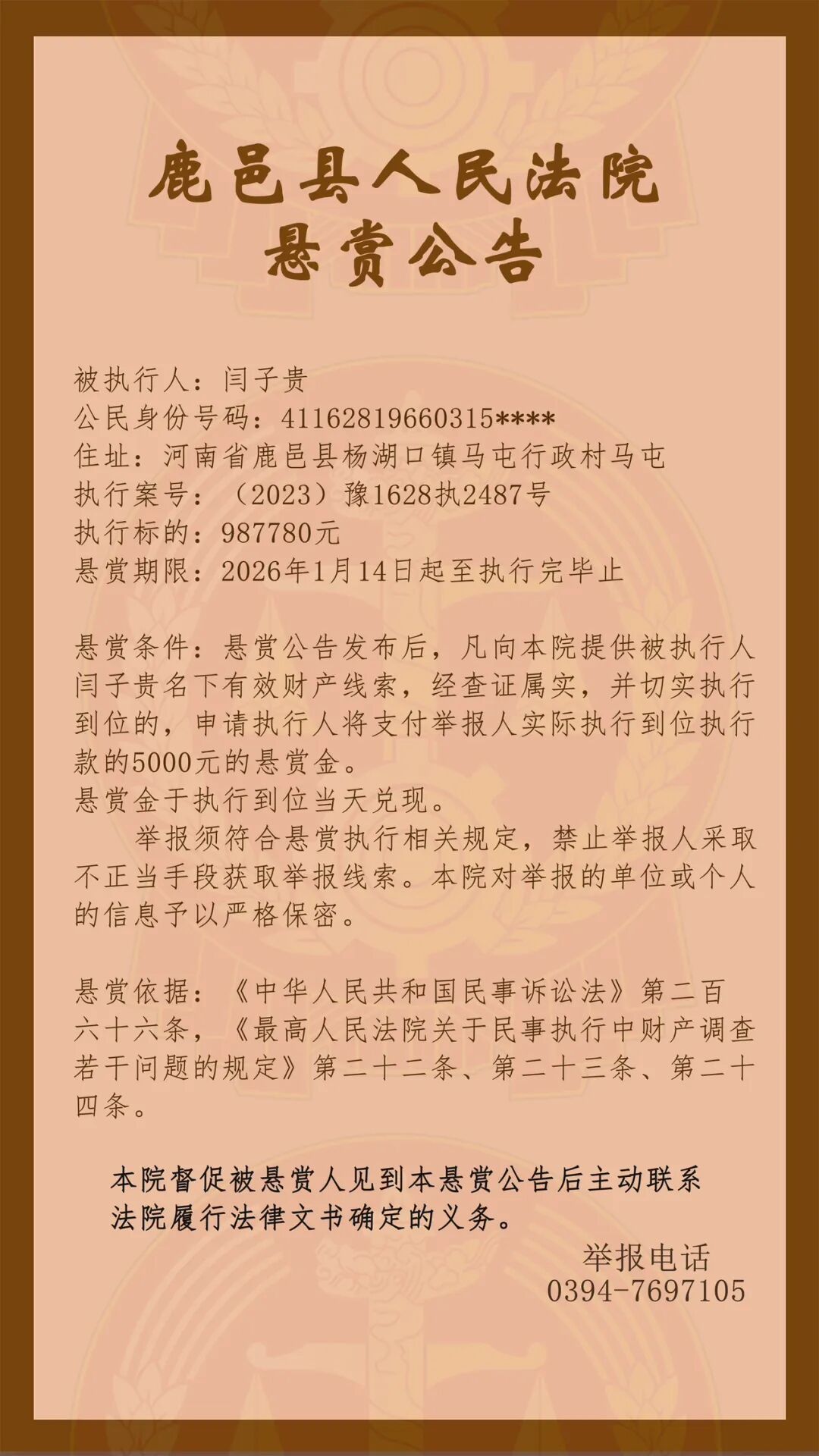 鹿邑县人民法院悬赏公告(2026年第2期)