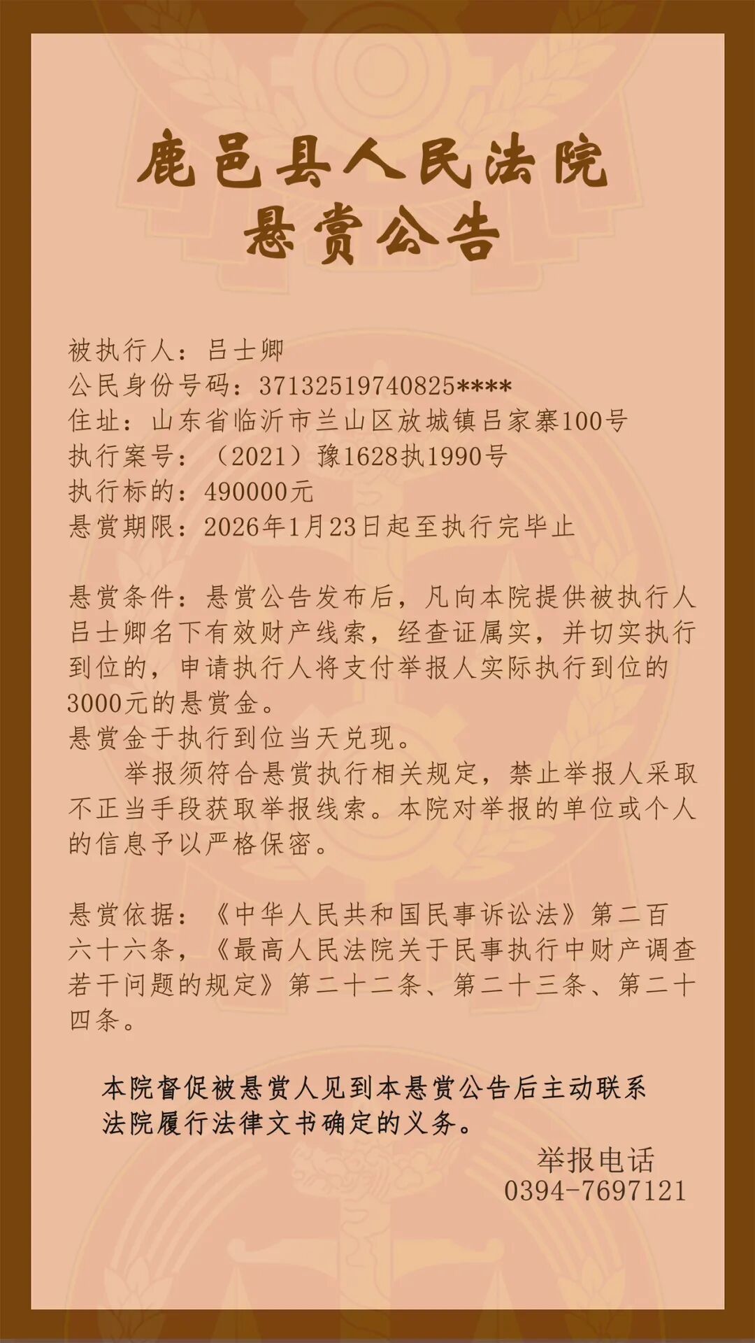 鹿邑县人民法院悬赏公告(2026年第4期)