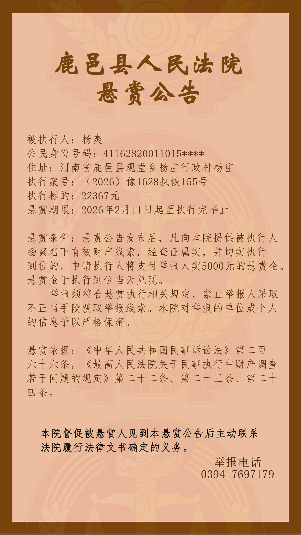 鹿邑县人民法院悬赏公告(2026年第7期)
